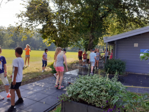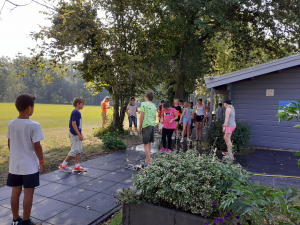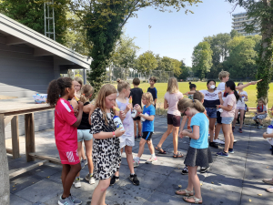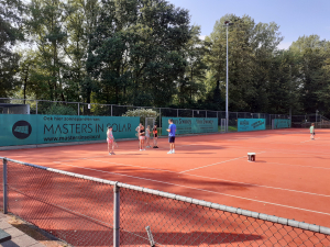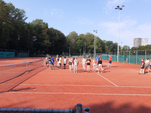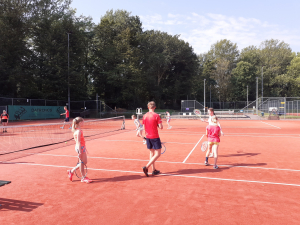 In twee groepen hebben in totaal 55 kinderen getennist Bart, Merel, Olaf en Mats. Deze activiteit was georganiseerd in samenwerking met sportservice Wageningen. Het was een warme ochtend van 30 graden, waarbij de sproeier en ijskoude racketjes zorgden voor afkoeling.