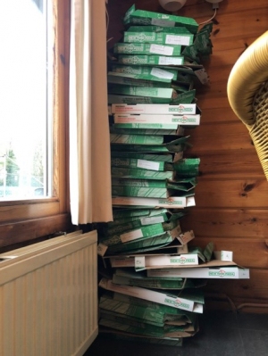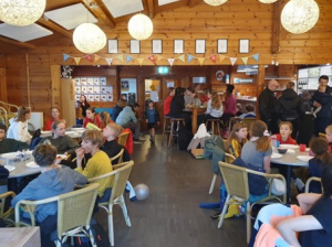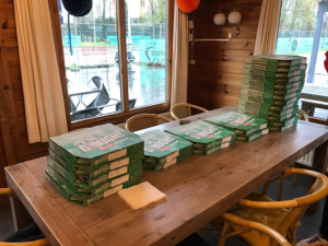 Na al deze inspanningen ging het in optocht terug naar de kantine, waar elk team gezellig een plekje zocht. Gelukkig waren de eerste pizza’s al gekomen, zodat iedereen gelijk kon aanvallen! Er werd goed gegeten, want van 50 pizza’s konden de dozen later worden weggegooid.