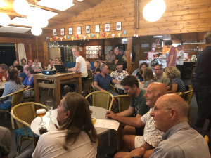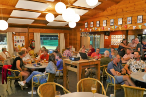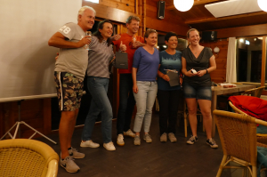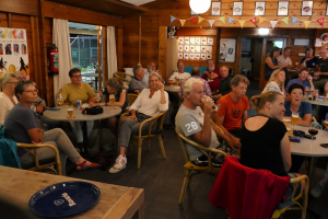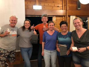 Tijdens dit eerste onderdeel van de avond bleek dat aanleg voor tennis helpt maar geen garantie is voor een goede score bij het minigolven. Gelukkig raakten er niet al teveel balletjes kwijt en gingen we toen het donker werd naar ons clubhuis waar het traditionele gebak van Mekking al klaar stond. Na de prijsuitreiking voor het minigolven (met de eerste prijs voor Inge Hoogland) en het bedankje van de voorzitter begon de grote NVLTB pubquiz. Na de eerste twee rondes (sport - en NVLTB kennis) gingen er twee teams aan kop. De laatste ronde met muziekvragen gooide echter alles weer om waardoor uiteindelijk het team van Ton, Mandy, Marjoleine, Erwin, Carla en Tiny er met de eerste prijs vandoor ging: zij mochten als eerste kiezen van de rijk gevulde cadeau tafel met prachtige prijzen beschikbaar gesteld door onze sponsoren Winners, Cicuto, Woudenberg, New York Pizza, Keurslager Elings, Ici Paris, en Brownies en Downies. Daarna werd er nog gezellig na geborreld . Wat is het toch elk jaar fijn om met alle vrijwilligers zo’n gezellige avond te hebben. Tot volgend jaar!