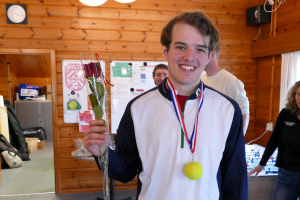 In deze poule streden ook Michiel Hoefsloot, Sake de Vlas en Guido Cramwinckel mee om de titel. Iedere zondag om 20 uur zijn zij op de baan te vinden en worden er singles gespeeld in continue wisselende samenstelling tussen iedereen die er is. Dus: volgend jaar meedoen om de prijzen? Ga zondagavond ‘tossen’! Dat dit effect heeft blijkt wel uit het feit dat Michiel in de kwartfinale met een knieblessure opgaf in de super-tiebreak bij 9-8. Dat is hoe de tennis etiquette het voorschrijft. Zo is het ook gebruikelijk om je af te melden als je ziek of geblesseerd bent! Dat gebeurde in een opvallend aantal gevallen niet. De apotheose in deze poule werd een finale tussen de twee mastodonten Sake en Guido. Mooi om te zien dat hun beider partners hen aan kwamen moedigen en tot en met de prijsuitreiking bleven om ze te steunen!