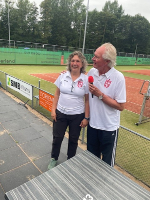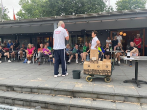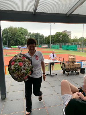 Alle winnaars werden tijdens de feestelijke prijsuitreiking letterlijk én figuurlijk in het zonnetje gezet. Maar niet eerder dan dat Mariska Nijenhuis ten overstaan van alle aanwezigen hartelijk werd bedankt voor bewezen vrijwillige diensten in de veteranen commissie. Uit handen van Jan Zijlstra kreeg zij namens het bestuur een welkome attentie vergezeld van een weelderige bos bloemen. Ook Carla Mulders werd als wedstrijdleider door Jan uit naam van alle deelnemers in de bloemen gezet. Niet omdat ze stopt, maar omdat ze al jaren op onnavolgbare wijze de motor is achter dit prachtige toernooi waar het onmogelijke mogelijk gemaakt wordt. Weer, verhinderingen, blessures: het maakt niet uit, want Carla plant en organiseert er omheen. Onder luid applaus nam Carla de bloemen blij verrast in ontvangst.