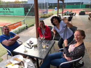 Tot slot de AGENDA. Op 12 juni kidsday. Hopelijk gaat er dan veel jeugd met (rijdende) ouders met Bart en Merel kijken bij Kiki in Rosmalen. Een goeie voorbereiding voor jeugd, ouders, clubgenoten en tennisliefhebbers is het om op 26 mei en 2 juni te komen kijken als het team van Merel en Bart tennist op topniveau. De vorm van het begin van het seizoen is er dan hopelijk weer. Want inderdaad heeft Merel heerlijk gespeeld tegen Olga Kalyuzhnaya die waarschijnlijk alleen om die achternaam al uit het profcircuit geweerd wordt. Mooi dat het goed ging, leuk dat bijna iedere game égalité was, maar Leon Lobach heeft het ons in de competitietraining echt héél duidelijk gemaakt: “Ik speel graag heel lekker, maar win liever lelijk!” Gelukkig is hem dat ook wel weer gelukt en wisten ook Merel en Edith de damesdubbel te winnen. Toch twee belangrijke punten in de strijd om lijfsbehoud!
