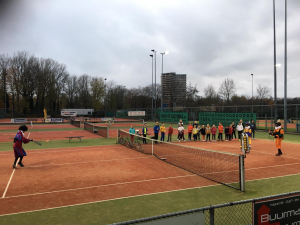Tijdens de warming-up van Merel op woensdagmiddag 27 november kwamen er opeens 3 Pieten de baan op! Zij wilden ook graag leren tennissen maar konden er niets van. En ze hadden ook zo’n vreemd racket, het blad zat helemaal scheef. Gelukkig waren de 2 hulpjes Suzie en Irsa wat handiger met hun racket. Na alle oefeningen hadden deze Pieten wel heerlijk veel pepernoten waar alle 20 kinderen die meededen met deze activiteit van hebben genoten. Tussendoor nog even warme chocomel gedronken in het clubhuis en dan toch weer de baan op.